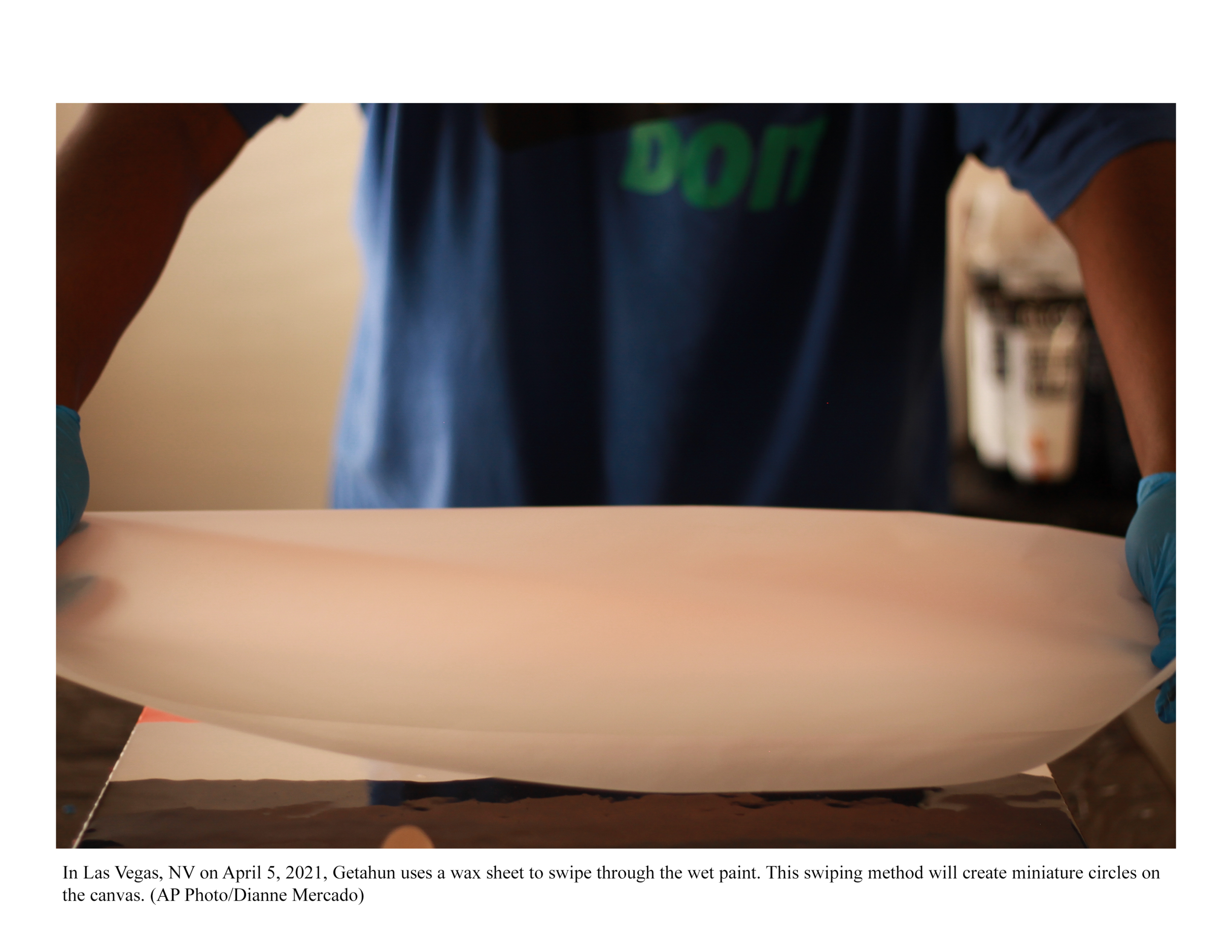 The first step in the process is buying the supplies. Being the famous artist he is, when we first walked into Blick Art Materials, the employees greeted him and took him under his care, helping him finding the exact supplies needed to create his pieces. Getahun said he goes there pretty often. In his allotted schedule, Getahun usually creates his artwork in a close timeframe from when he buys the supplies. I was able to take photos of him creating the week after. To create his art, it took about half an hour— the drying time on the other hand was of a longer duration, or 24 to 48 hours. He does an additional two weeks of drying to get the specific canvas texture that he wants. During the drying time, he takes photos of them and waits to see if any customers want to buy—Getahun says depending on the color palette of the piece, it could sell the same day he posts the listing, or it take a few weeks. After it sells, he takes it to his favorite shipping place to take care of the packaging.